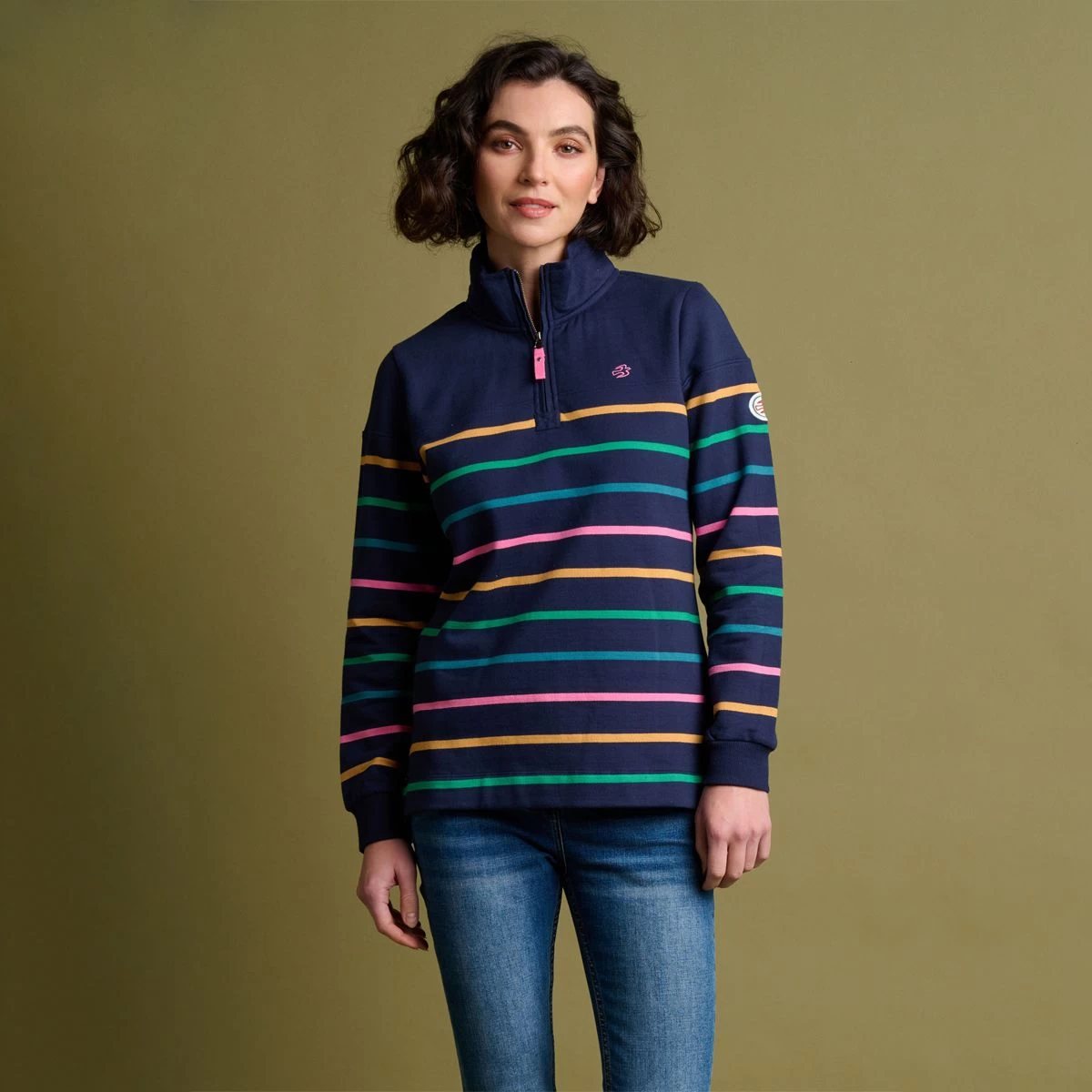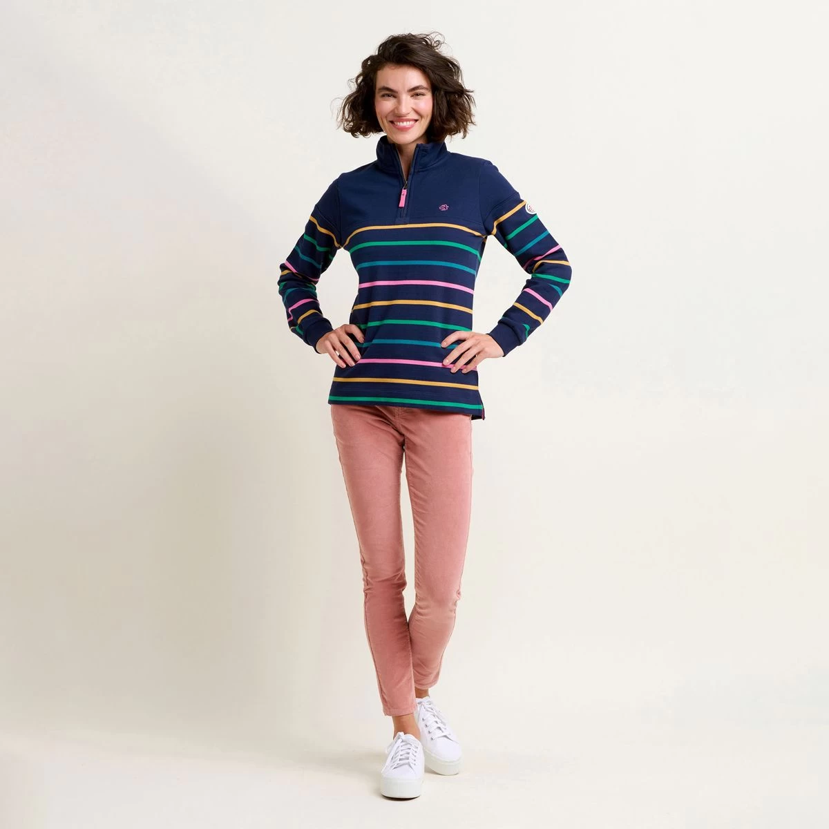 The navy hue sets the foundation for timeless elegance, while the yarn dyed stripes add a subtle pop of retro colour, making this sweatshirt truly stand out from the crowd. Whether you’re heading out for a stroll in the park or meeting friends for a cosy brunch, this sweater is the perfect choice for any occasion.