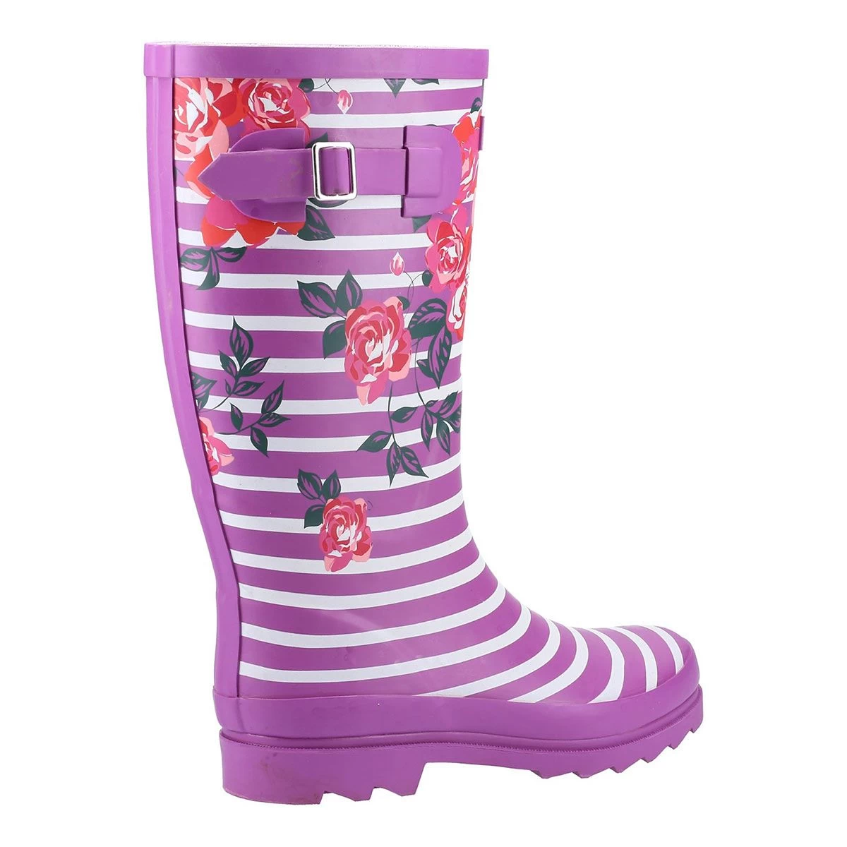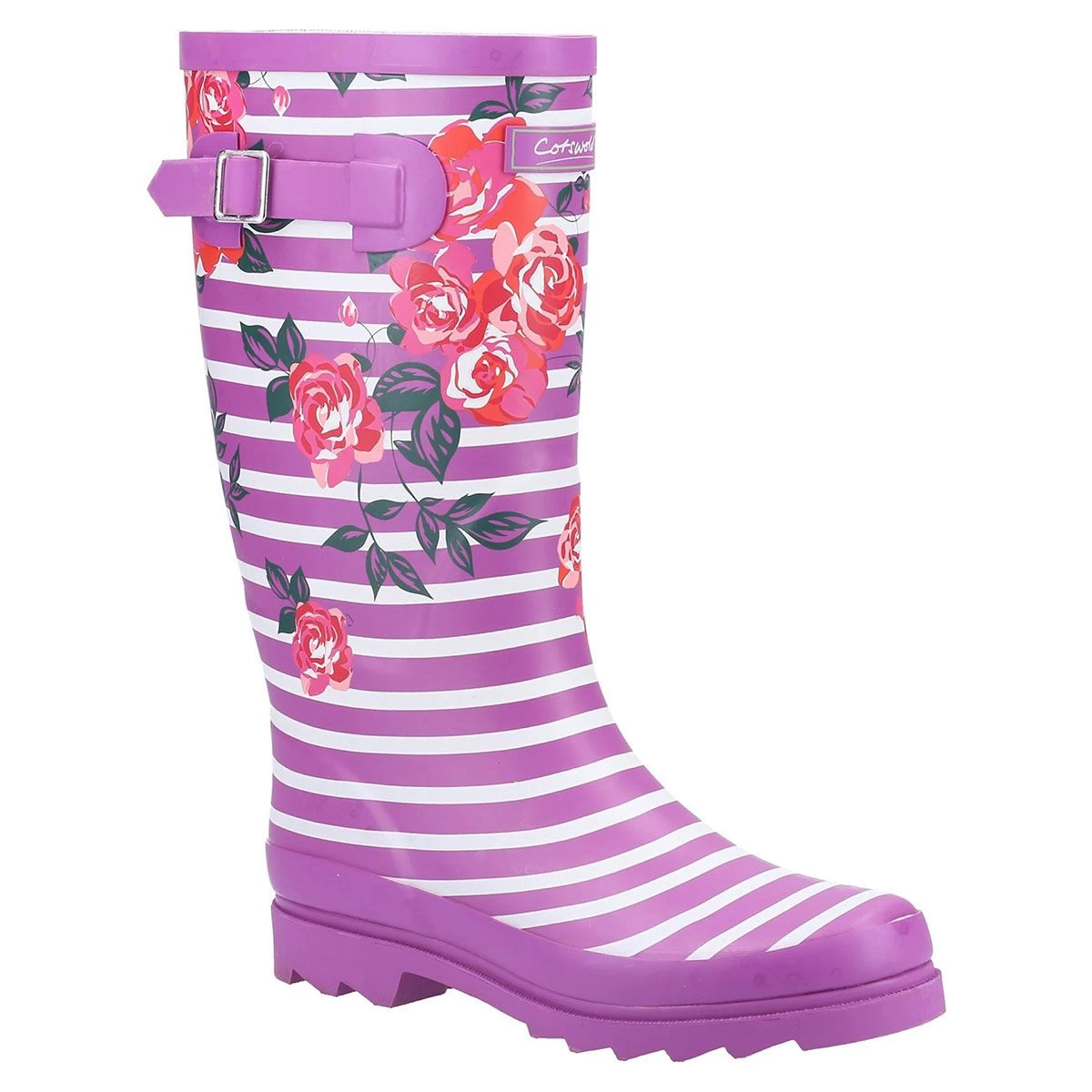 Step into the outdoors in style with these fashionable ladies Chilson wellingtons from Cotswold. Finished with a simple yet lovely design of purple and floral stripes, these wellies will be the perfect finishing touch to your outfit whatever the occasion. Made from a durable rubber, with a memory foam footbed the spacious yet secure fit also allows the boots to be pulled on and off easily.
