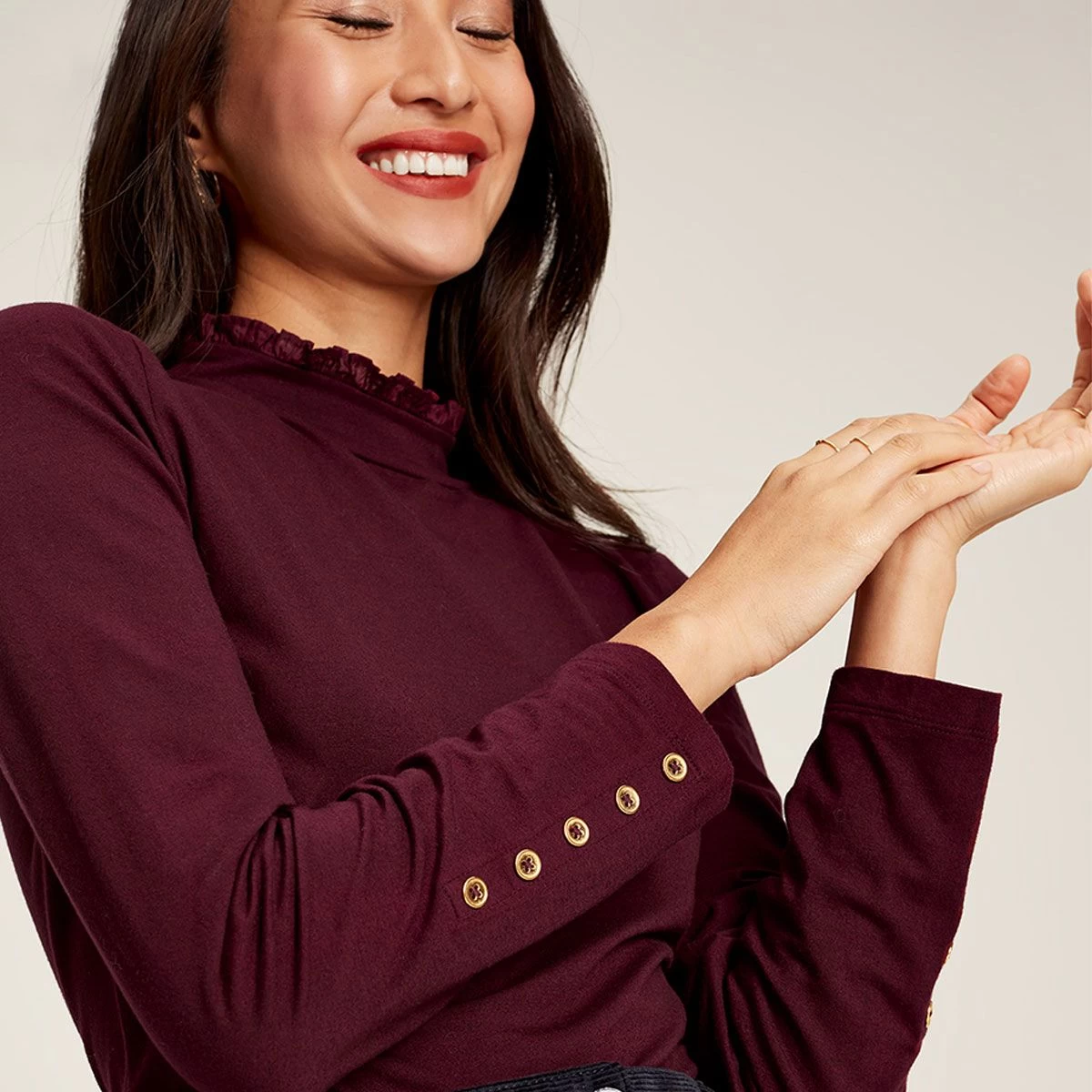 This roll neck also features a gold button placket on the sleeves and a subtly embroidered hare to capture the Joules charm elegantly and effortlessly.