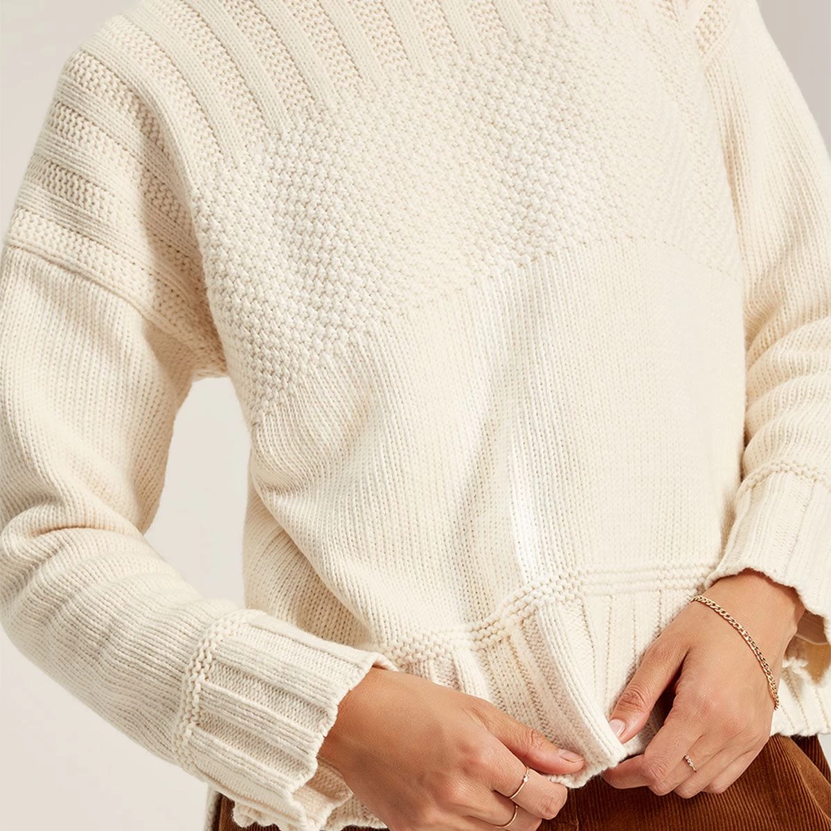 Joules presents their beautiful Joyce Roll Neck Jumper with knitted patterns across the shoulders, chest and cuffs, a great piece for all year round including those cooler summer evenings or winter woodland walks with comfortable and breathable cotton that is kind to the skin. The creamy coloured Buttermilk in this knit means you can add it to any outfit with ease, whether it be on top of a summer dress or with your favourite pair of jeans and winter boots.