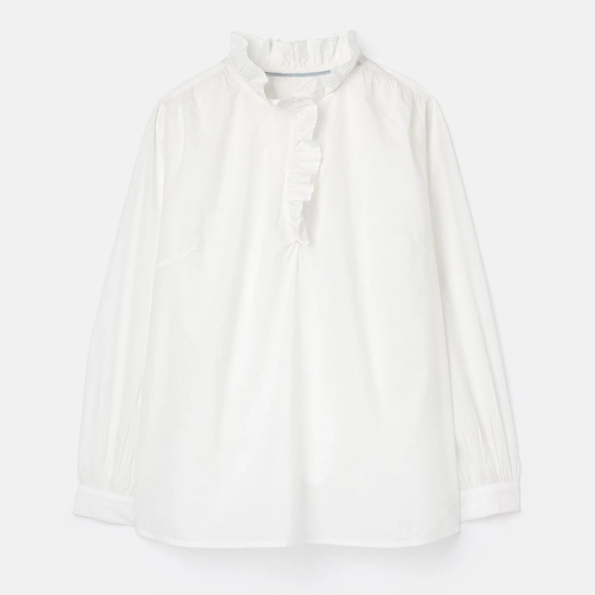 Joules presents your new favourite wardrobe staple, the Melanie Blouse. This beautifully designed and lightweight piece will become your most loved and worn item. A versatile blouse that would make the perfect partner when paired with a jumper or knitted layer with its charming frilled trim neckline that would add a pop of stylistic charm to any outfit. It would also style well as a solo statement piece with carefully crafted features including an elegant gathering at the shoulders and spine. The tailored fitted detail within the sleeves also makes this a standout blouse with gathered pleats and buttoned cuffs which add a sophisticated sense of style.