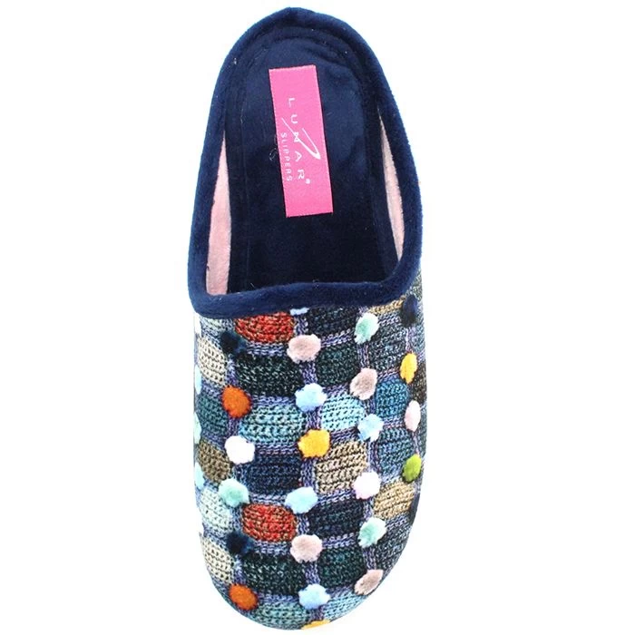 Stand out in these mule slippers from Luna. The fun knitted pom-pom textile design blends in with the matching trim, while the padded insole helps lessen foot fatigue and keeps your feet nice and snug, when walking about the house.