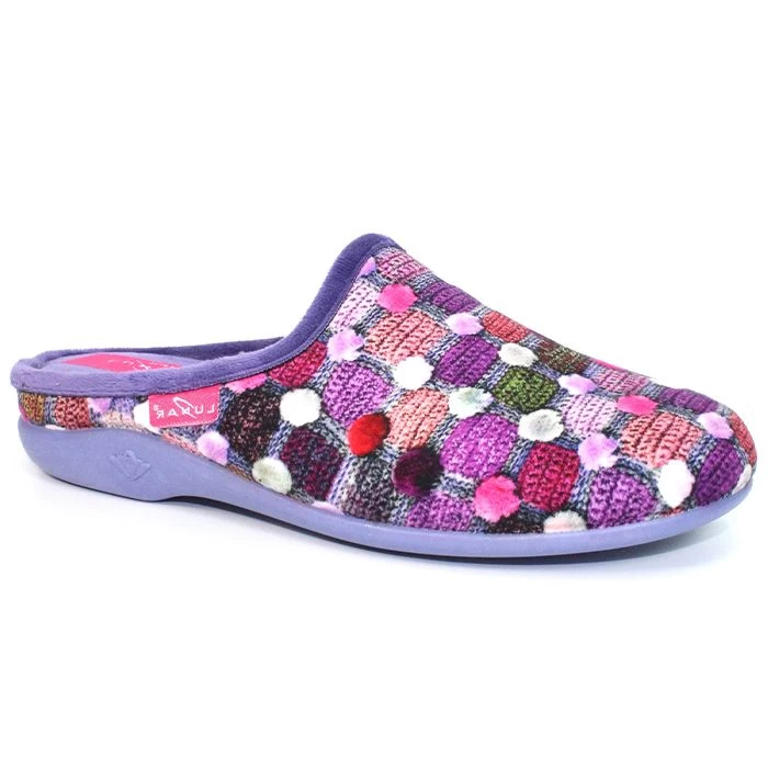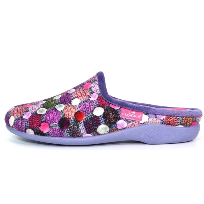 Stand out in these mule slippers from Luna. The fun knitted pom-pom textile design blends in with the matching trim, while the padded insole helps lessen foot fatigue and keeps your feet nice and snug, when walking about the house.