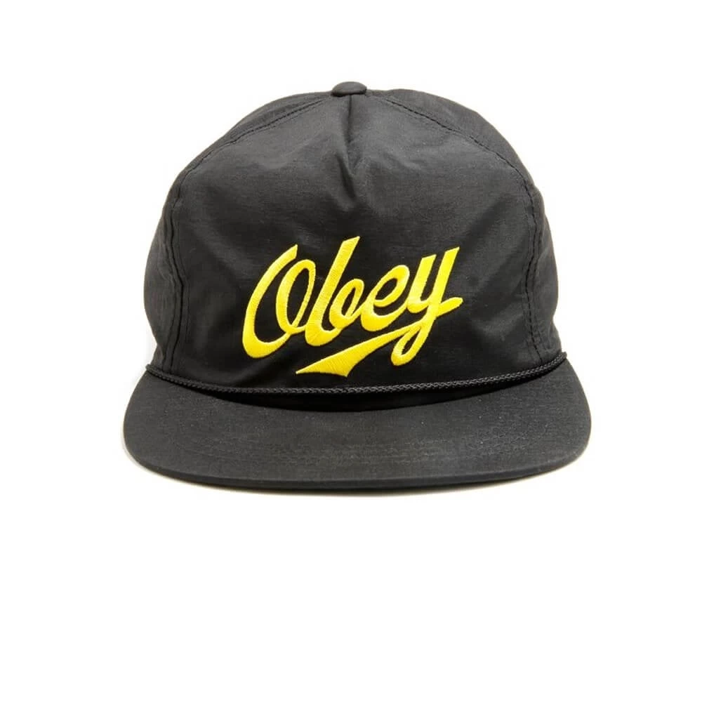 This fresh snapback features a solid black design, a crisp golden Obey logo embroidered onto the front and an adjustable strap.
