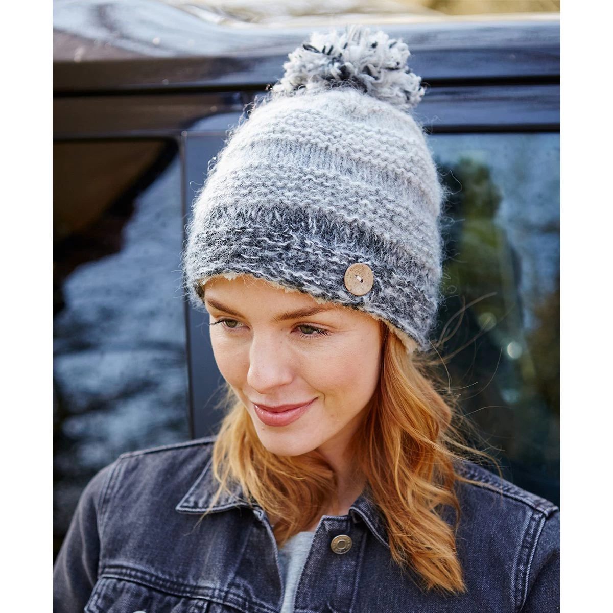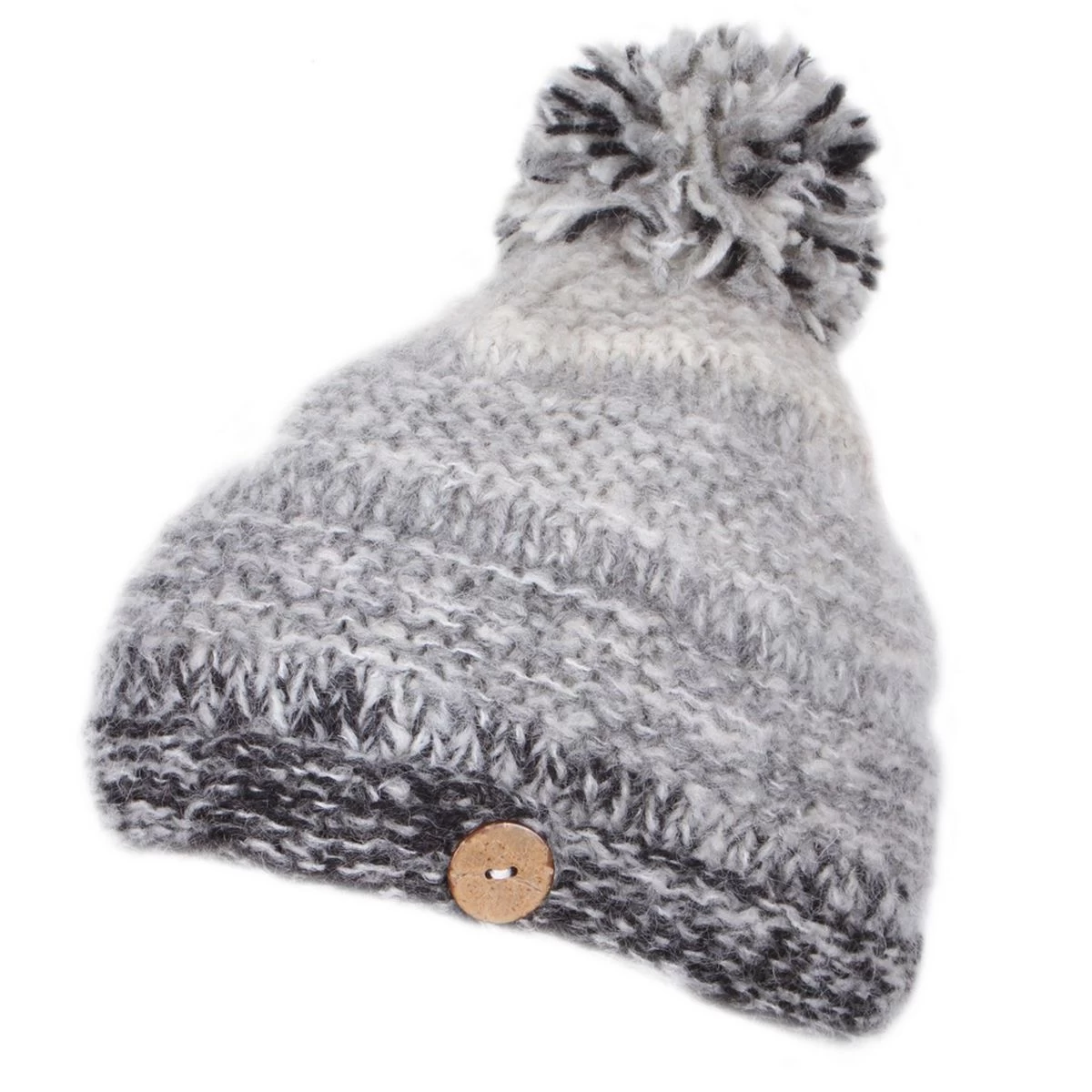 Be prepared for the winter weather with this charming Bobble Beanie by Pachamama. The Sierra Nevada design is fluffy, cosy and is a must-have for when you’re out and about in the frosty weather. Made from wool/mohair blend yarn and hand made in Nepal, you can be sure you’re getting high-quality from Pachamama. Sherpa fleece lining ensures this hat is as warm as can be whilst the ombre-effect grey colour will complement any outfit. The coconut button detail and pom-pom top finish the hat off beautifully.