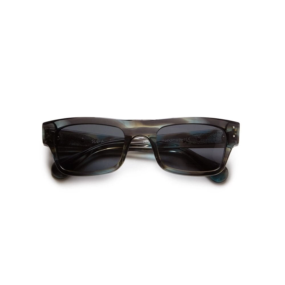 Sharped edged slightly thicker frame in smoky black with teal and brown tones, handmade Italian acetate. Polar Skate Co. silver metal logo plaque at the arms. Black Carl Zeiss Lenses with 100% UV protection and a seven-bar hinge with visible rivets on the temple. Comes in a luxurious faux leather hard-case and paper box. Cleaning cloth included.