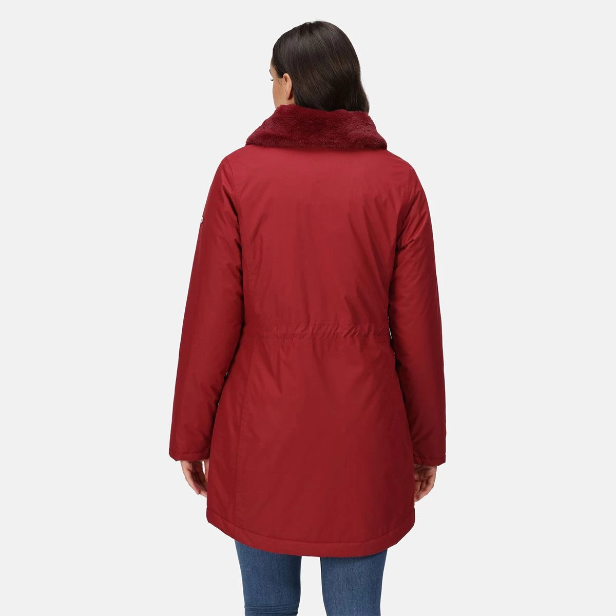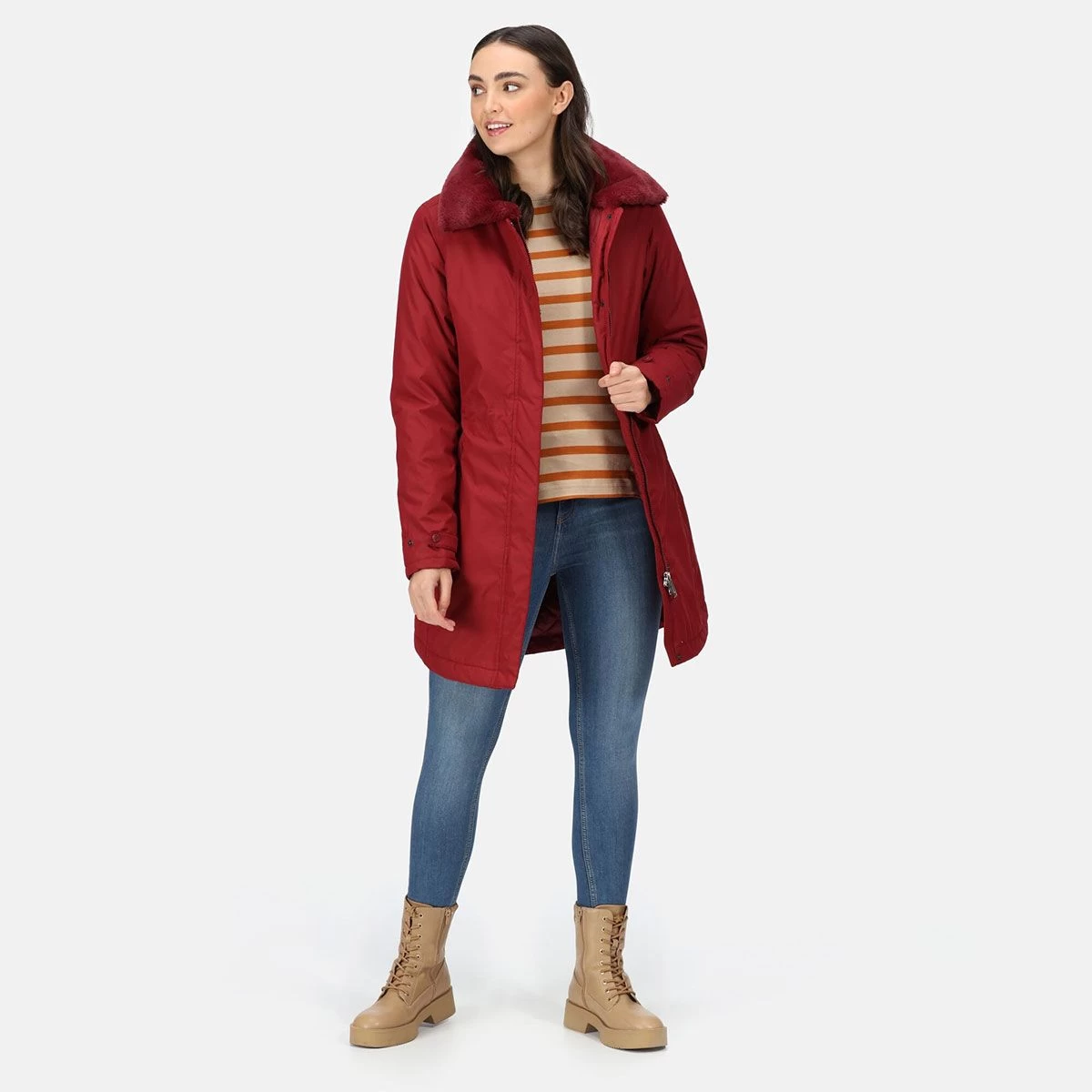 The long length of this coat combined with the hidden hood will give you extra coverage, whilst the adjustable shockcord waist gives a feminine shape. The deep red jacket is beautifully finished with a luxurious faux fur to the inner collar and two lower welt pockets, keeping you extra cosy and ready to take on the day.
